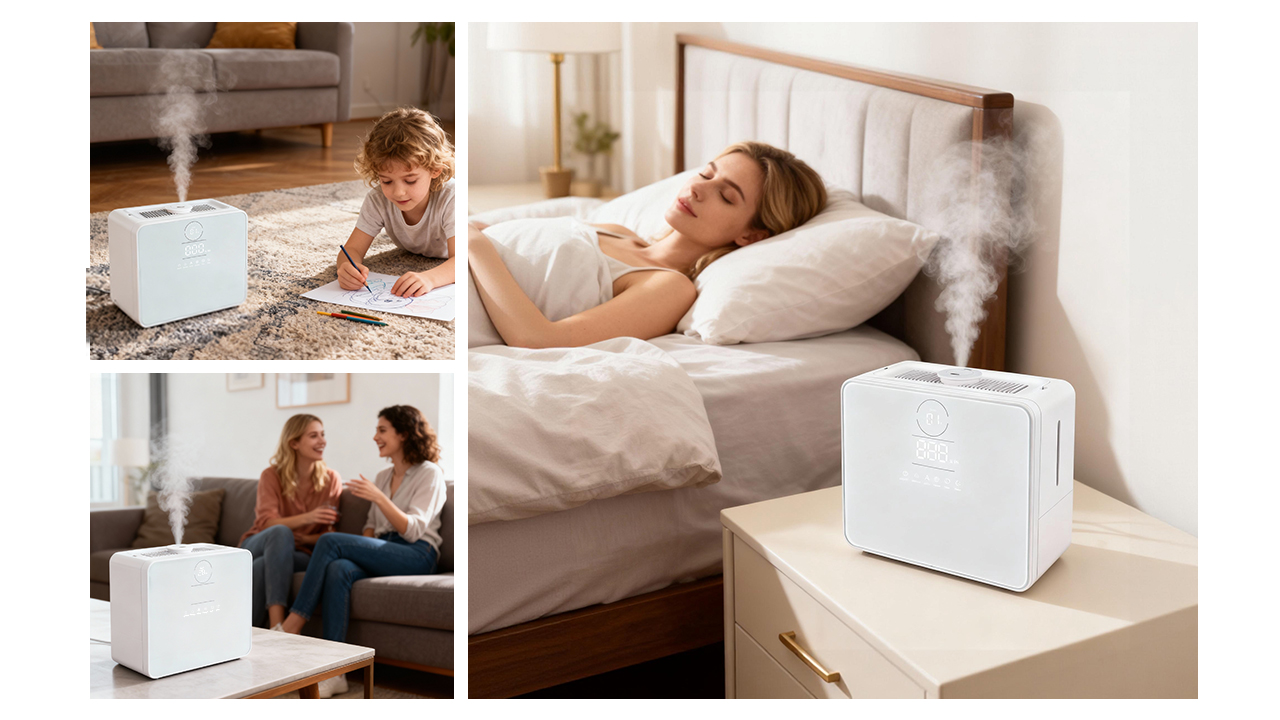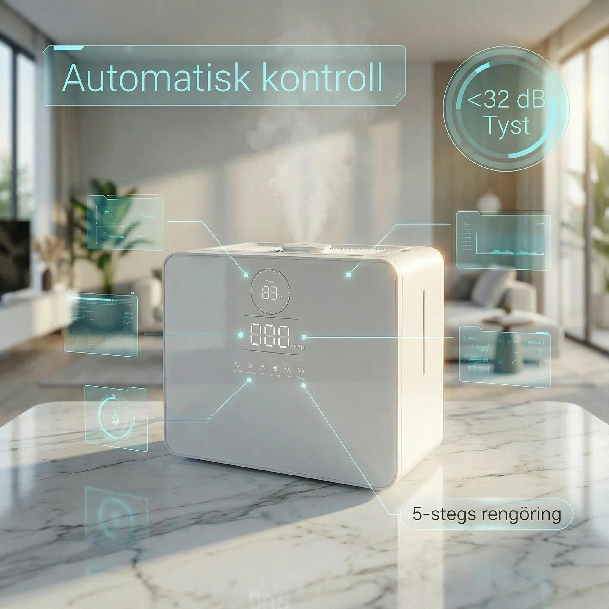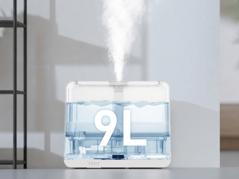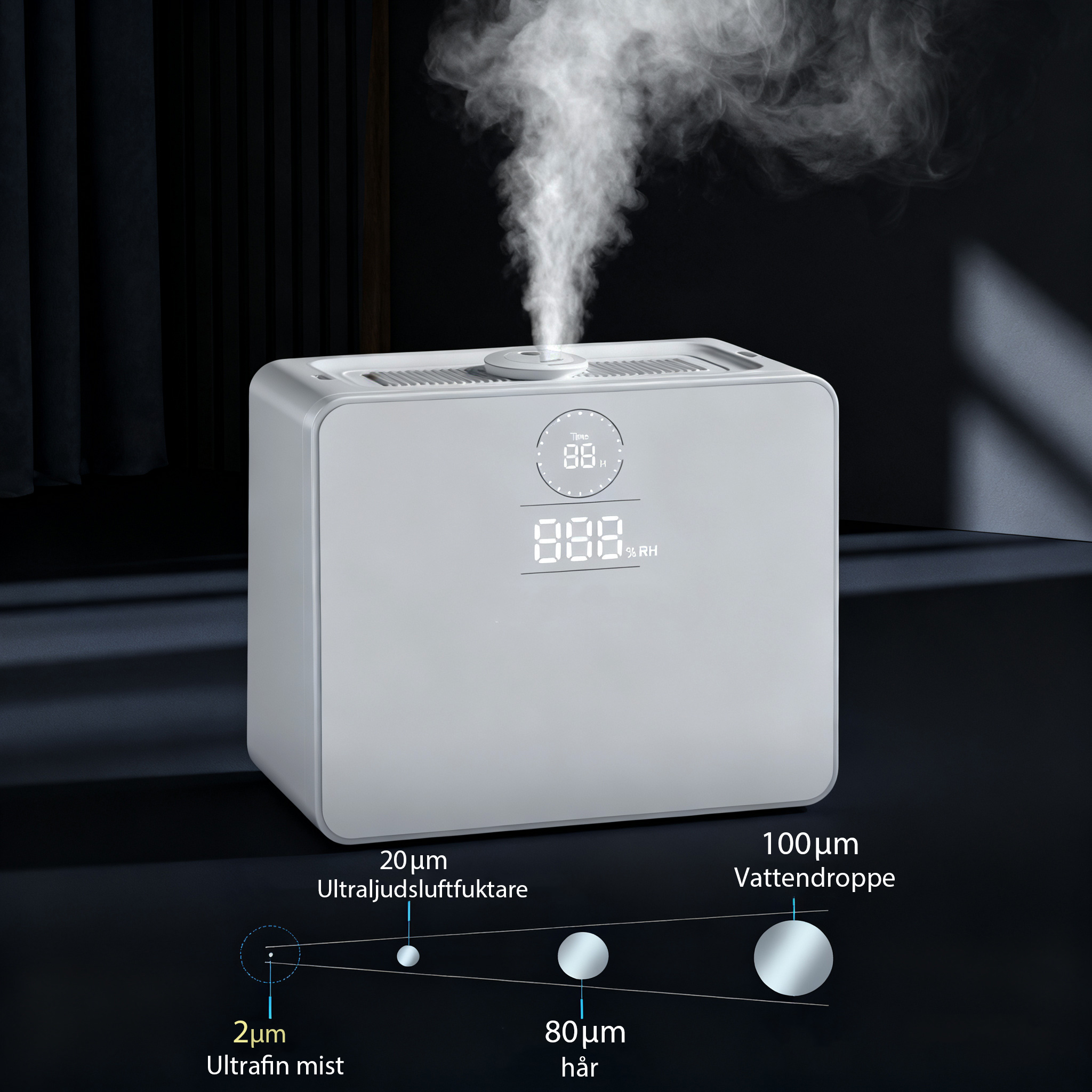 Ultraljudsteknik finfördelar vattnet till mikrodimmor på endast 2 μm, som sprids jämnt i rummet utan att blöta ytor.
