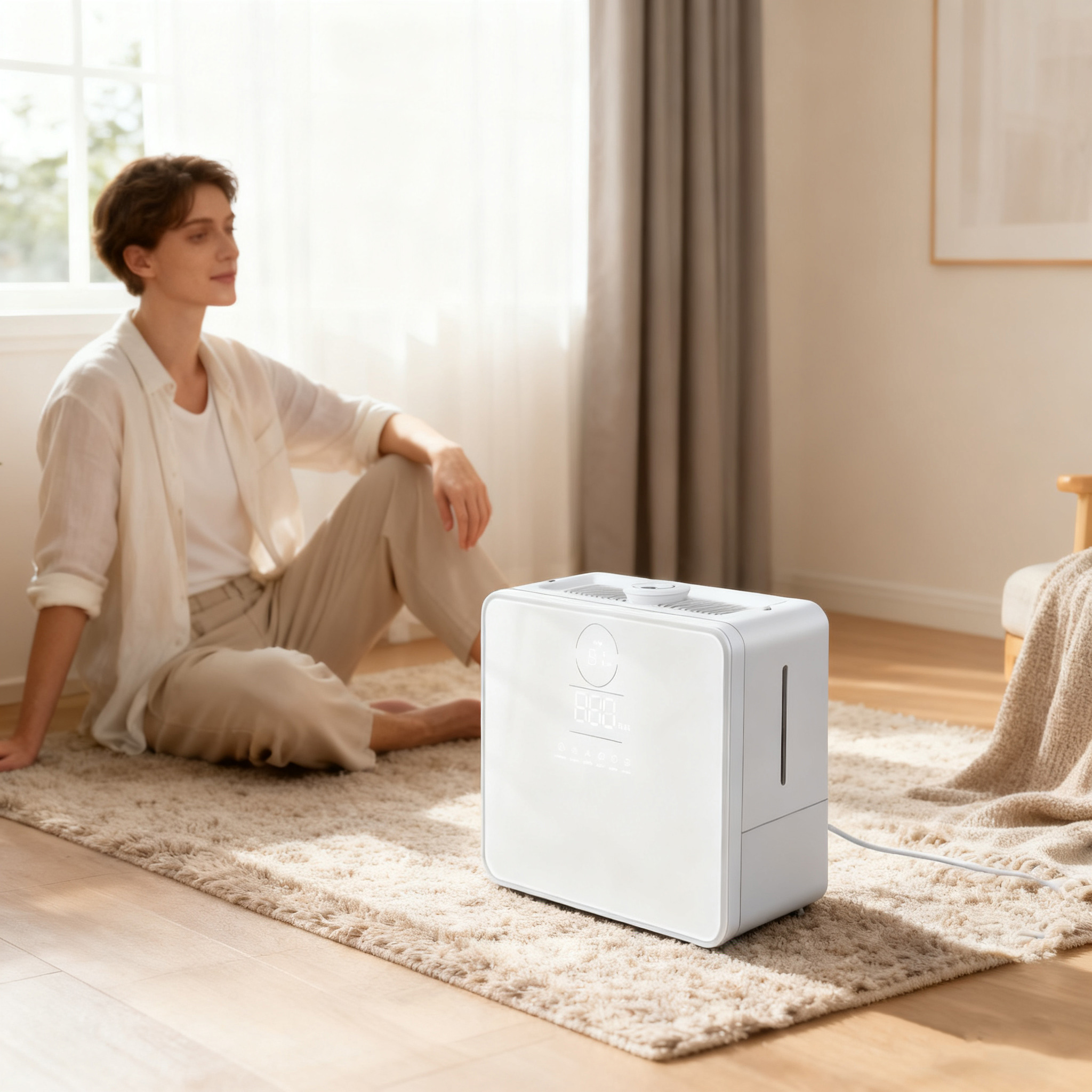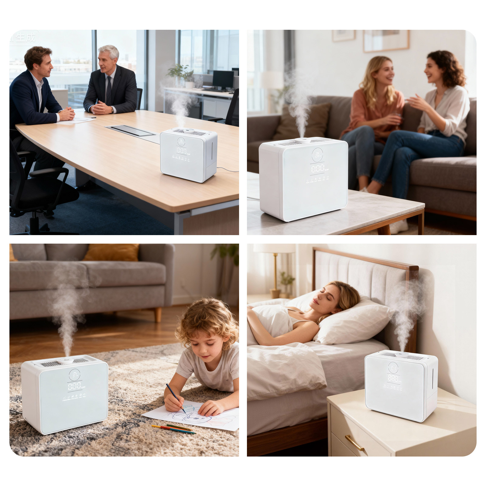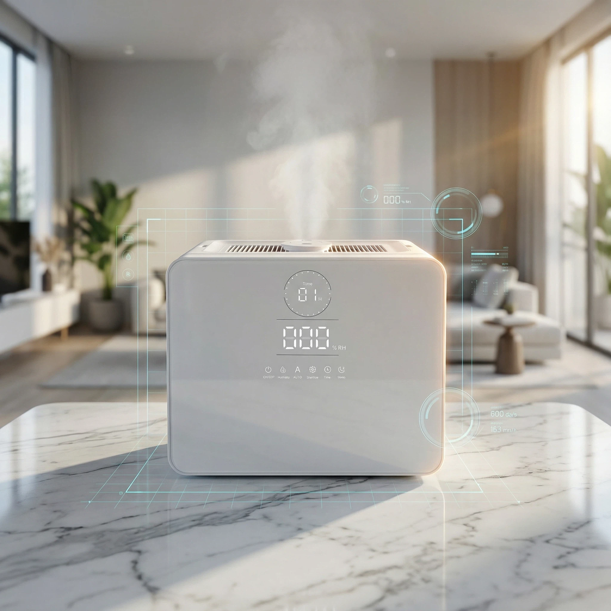 Ultraljudsteknik finfördelar vattnet till mikrodimmor på endast 2 μm, som sprids jämnt i rummet utan att blöta ytor.