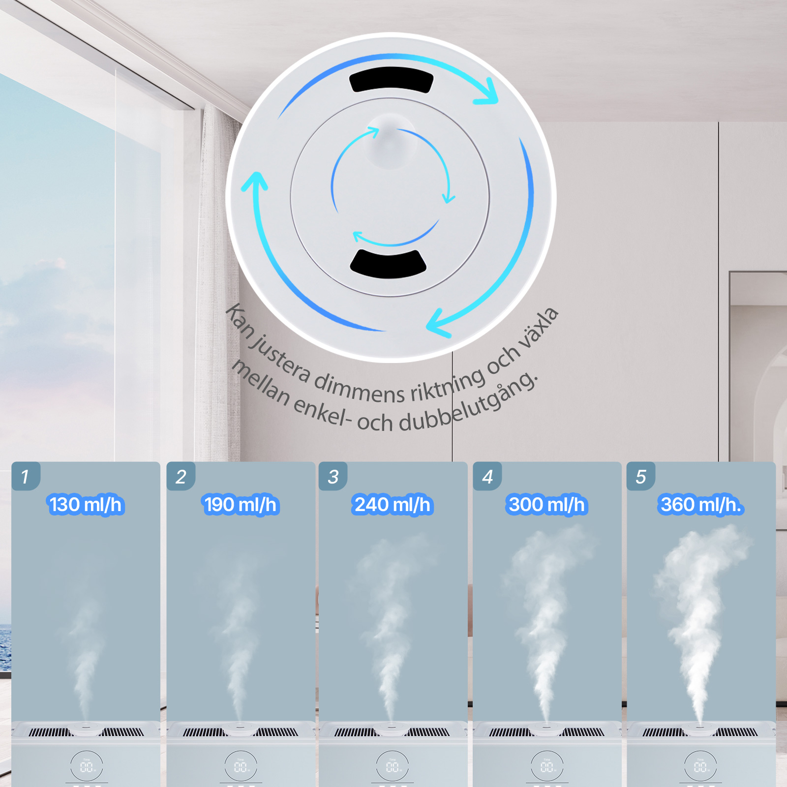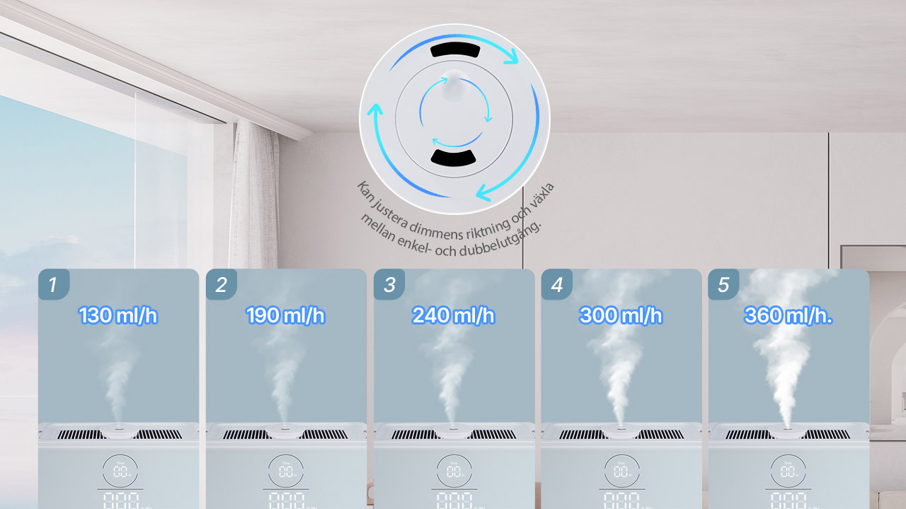 360° roterande dubbelutblås + 5 dimnivåer